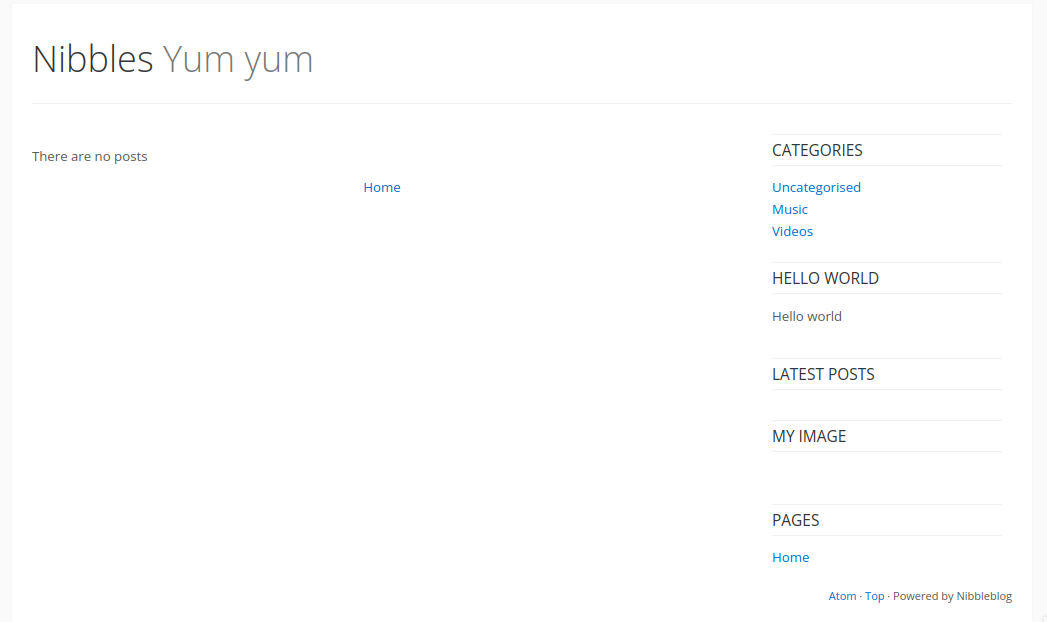 A standard blog page is shown, looks like it’s powered by nibbleblog. We can also note that the title is “Nibbles Yum yum”.
